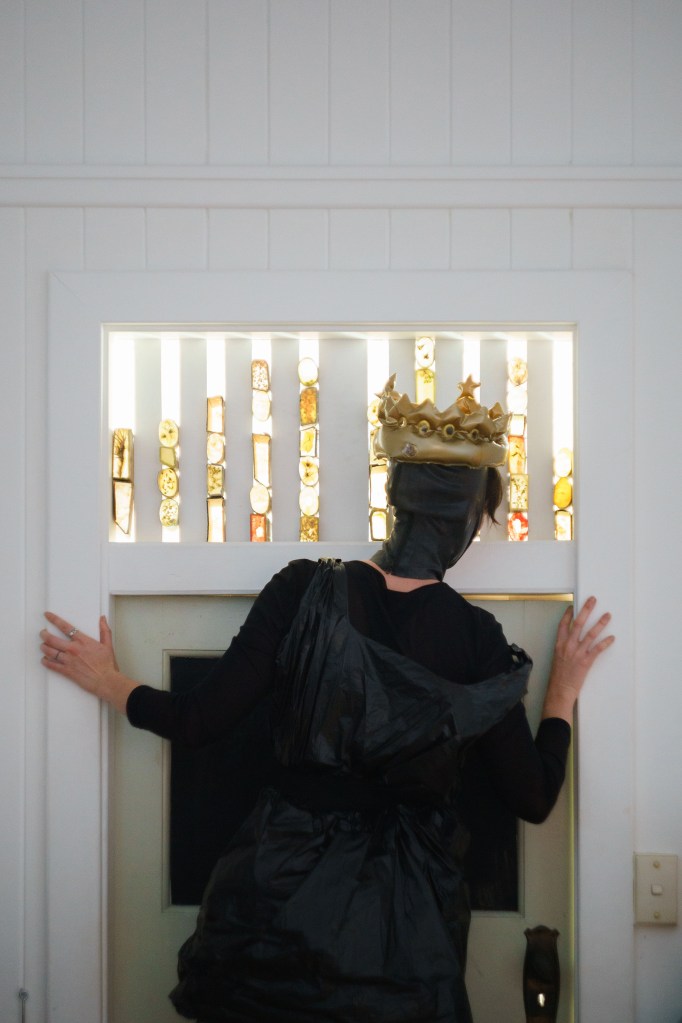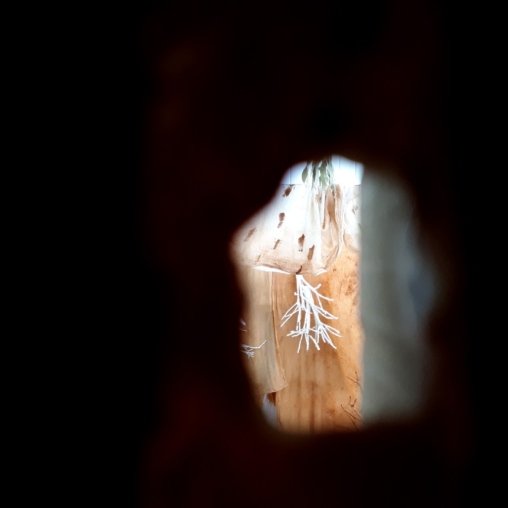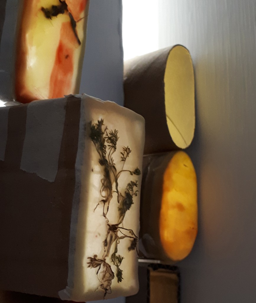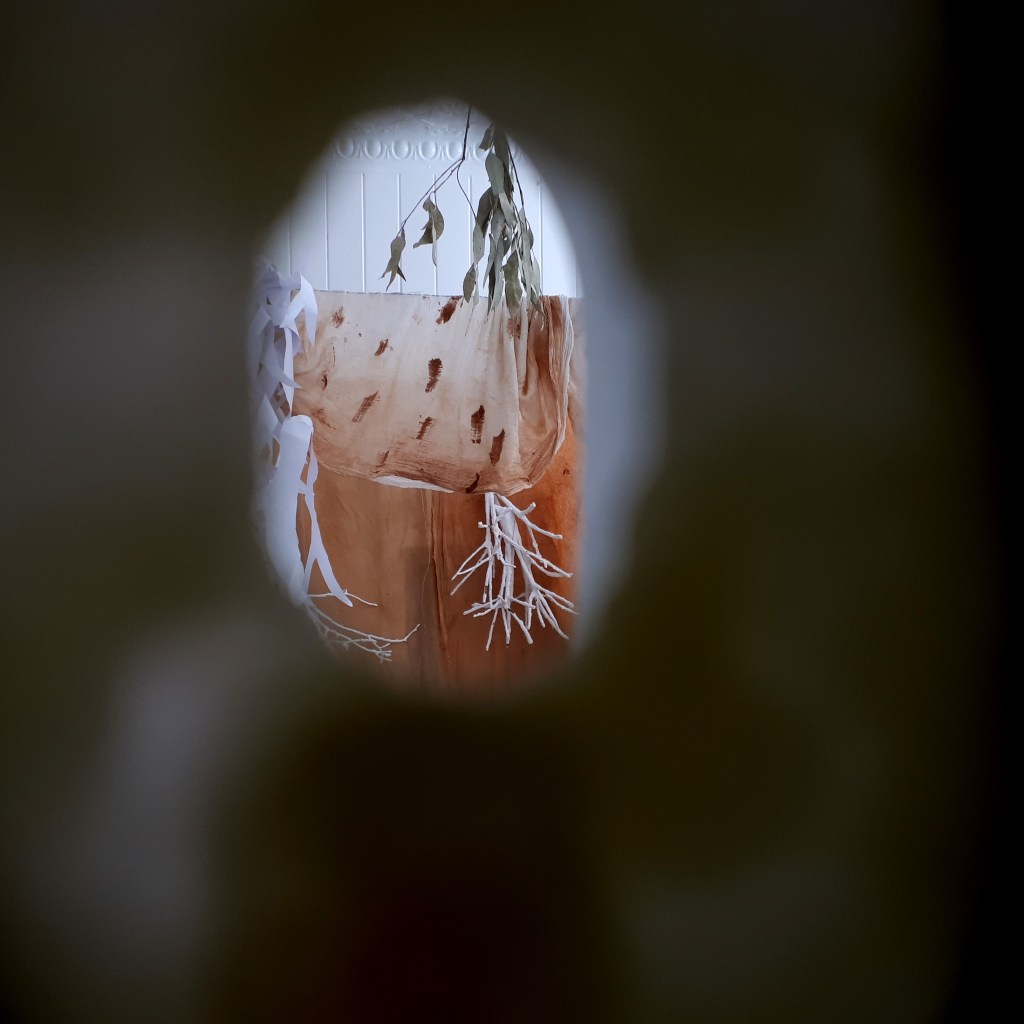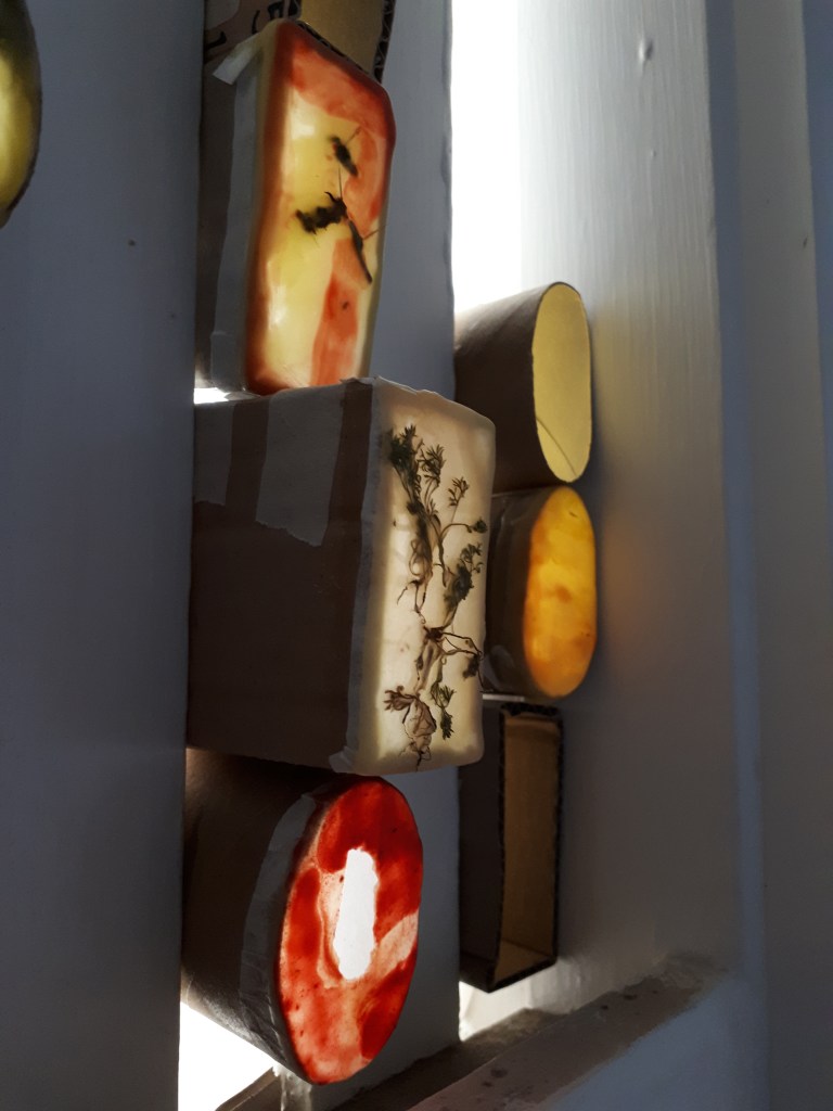 Beeswax from a local (to me) beekeeper; burs & prickles from the House Conspiracy garden with others ‘collected’ on my shoes and clothing; scavenged cardboard and paper. Studio backdrop – repurposed cotton soaked in local red clay soil, plaster coated branches. Site: Studio 3 and Studio 3 ventilation slats.