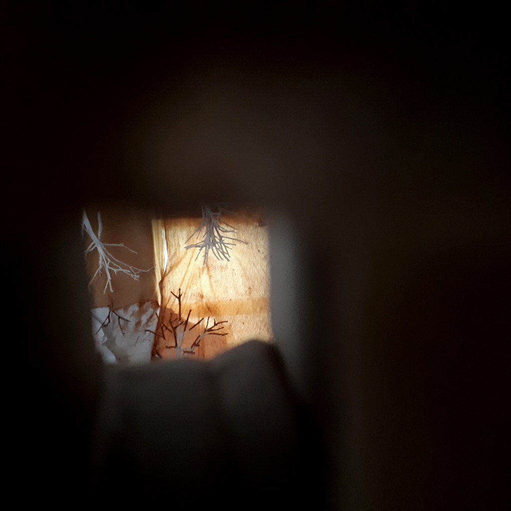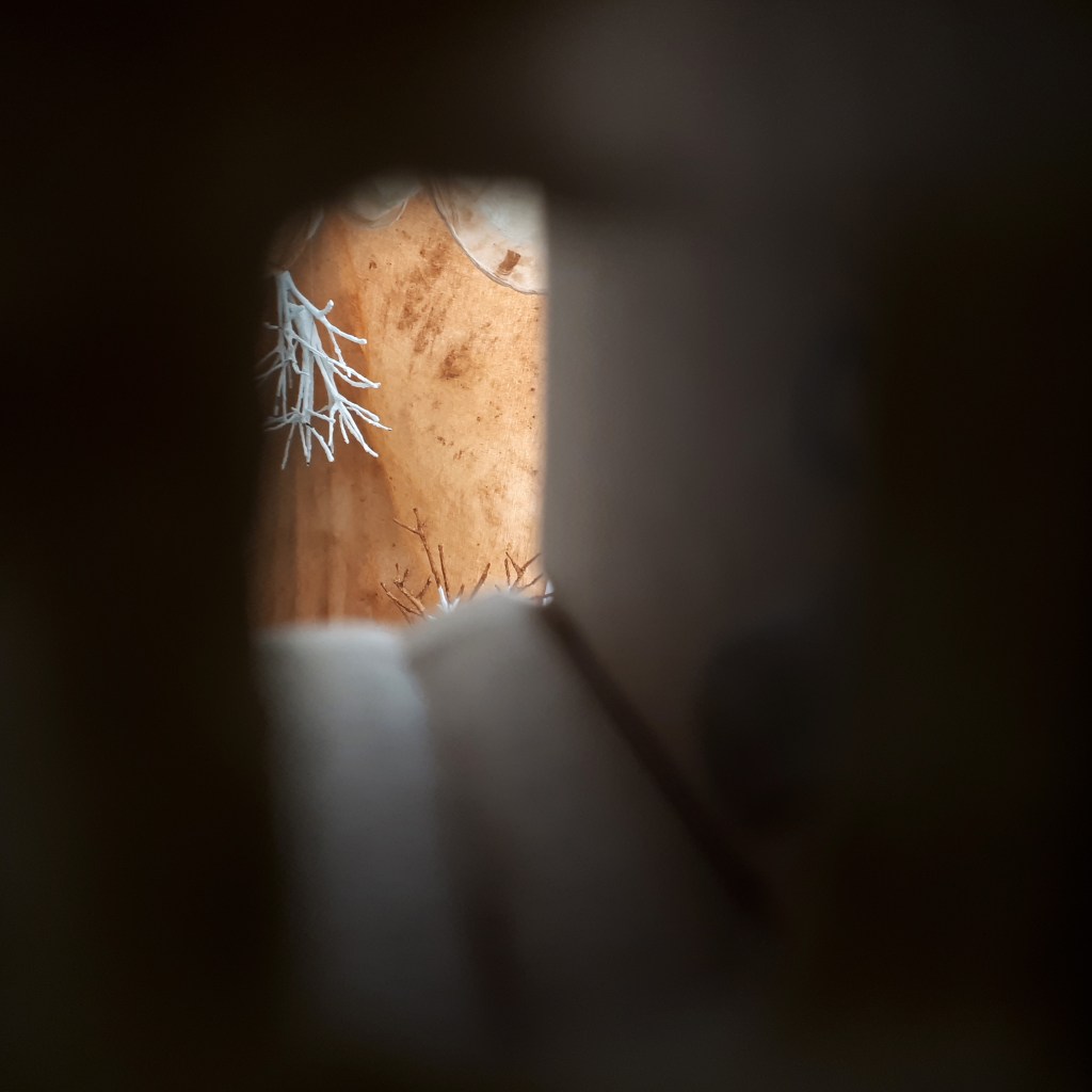 The installation required the audience to participate by climbing a foot ladder which enabled a access to a curated scene within the studio through ‘view finders’.